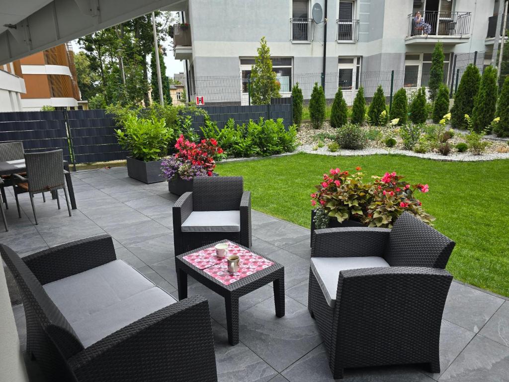 „Bardzo ładny lokal, wyposażony we wszystko co jest potrzebne na urlopie, bardzo duży plus to ogródek z fotelami i stolikiem. Okolica jest cicha a jednocześnie jest bardzo blisko do promenady."